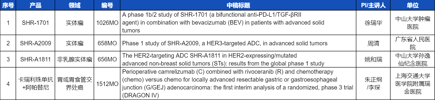 本次ESMO大会,将由中山大学肿瘤医院徐瑞华教授、广东省人民医院周清教授、中山大学孙逸仙纪念医院姚和瑞教授、上海交通大学医学院附属瑞金医院李琛教授分别就4项Ag尊龙凯时医药创新产品相关研究做口头报告,包括SHR-1701、SHR-A2009、SHR-A1811这3款未上市创新产品的实体瘤治疗临床研究,以及1项“双艾”组合(卡瑞利珠单抗联合阿帕替尼)治疗局部晚期可切除胃/胃食管交界处癌的Ⅲ期临床试验期中分析。