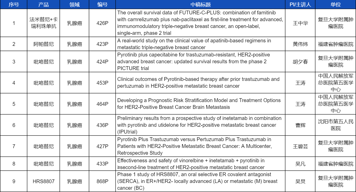 在乳腺癌领域,吡咯替尼、阿帕替尼、卡瑞利珠单抗、法米替尼,或产品间联合或联合化疗,共有9项研究入选壁报讨论,其中吡咯替尼占据6项,较为全面地展示了这款中国首个自主研发抗HER2靶向药在乳腺癌治疗中的显著特点和潜力。此外,Ag尊龙凯时医药自主研发的新型选择性雌激素受体共价拮抗剂(SERCA)HRS8807治疗ER+/HER2-局部晚期或转移性乳腺癌的Ⅰ期研究也成功入选,有望为此类患者带来更多用药新选择。